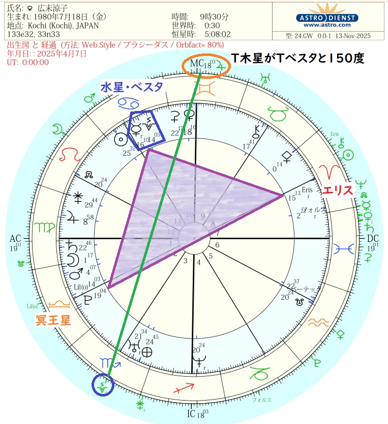 出生図でベスタはMC・木星の支配星である水星と重なるため、事故の焦点がここで重なるといえます。